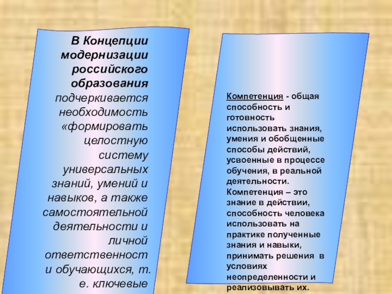 В Концепции модернизации российского образования подчеркивается необходимость «формировать целостную систему универсальных знаний, умений и навыков, а также самостоятельной деятельности и личной ответственности обучающихся, т.е. ключевые компетентности, определяющие современное качество образования».