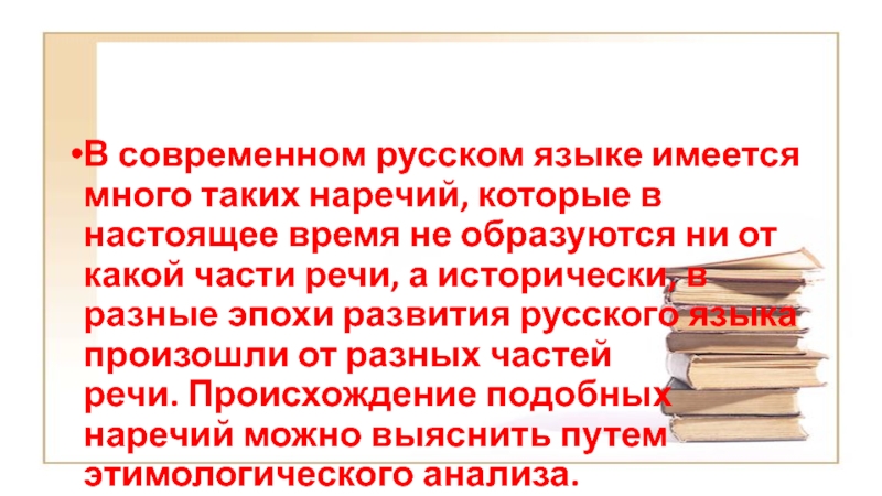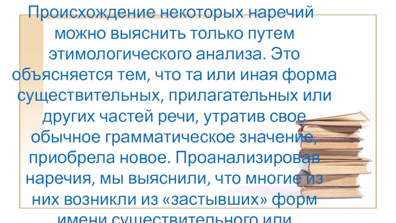 Слайд 28Происхождение некоторых наречий можно выяснить только путем этимологического анализа. Это объясняется