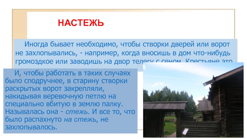 И, чтобы работать в таких случаях было сподручнее, в старину створки раскрытых ворот закрепляли, накидывая веревочную петлю на специально вбитую в землю палку. Называлась она - стежь. И все то, что было распахнуто на стежь, не захлопывалось.