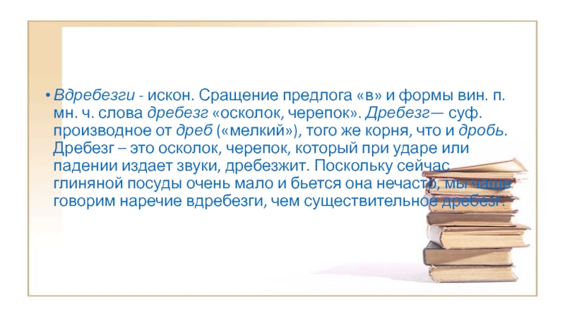 Слайд 24Вдребезги - искон. Сращение предлога «в» и формы вин. п. мн. ч.