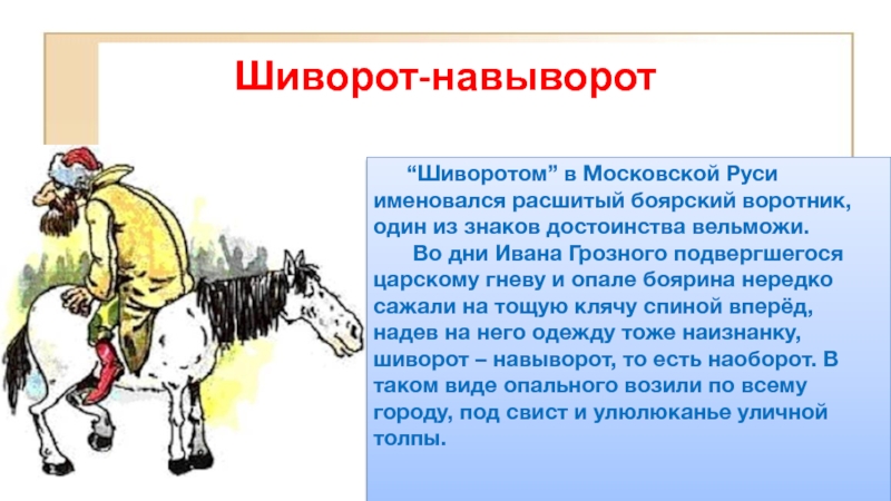 Во дни Ивана Грозного подвергшегося царскому гневу и опале боярина нередко сажали на тощую клячу спиной вперёд, надев на него одежду тоже наизнанку, шиворот – навыворот, то есть наоборот. В таком виде опального возили по всему городу, под свист и улюлюканье уличной толпы.