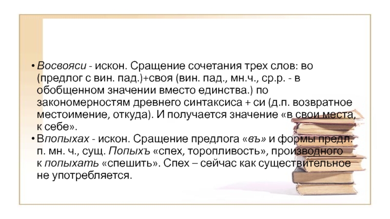 Слайд 25Восвояси - искон. Сращение сочетания трех слов: во (предлог с вин. пад.)+своя