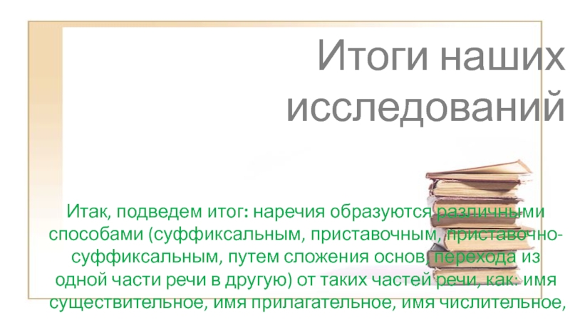 Итак, подведем итог: наречия образуются различными способами (суффиксальным, приставочным, приставочно-суффиксальным,