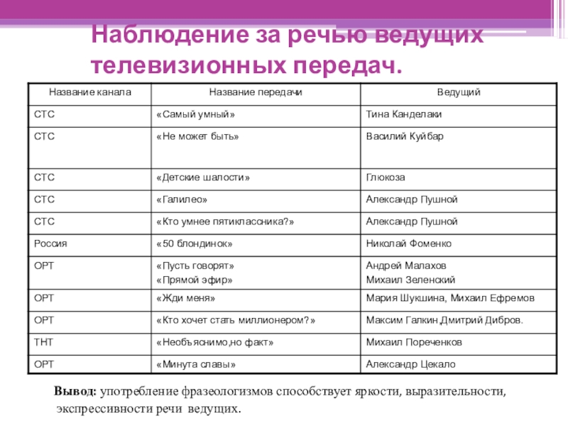Слайд 18Наблюдение за речью ведущих телевизионных передач.