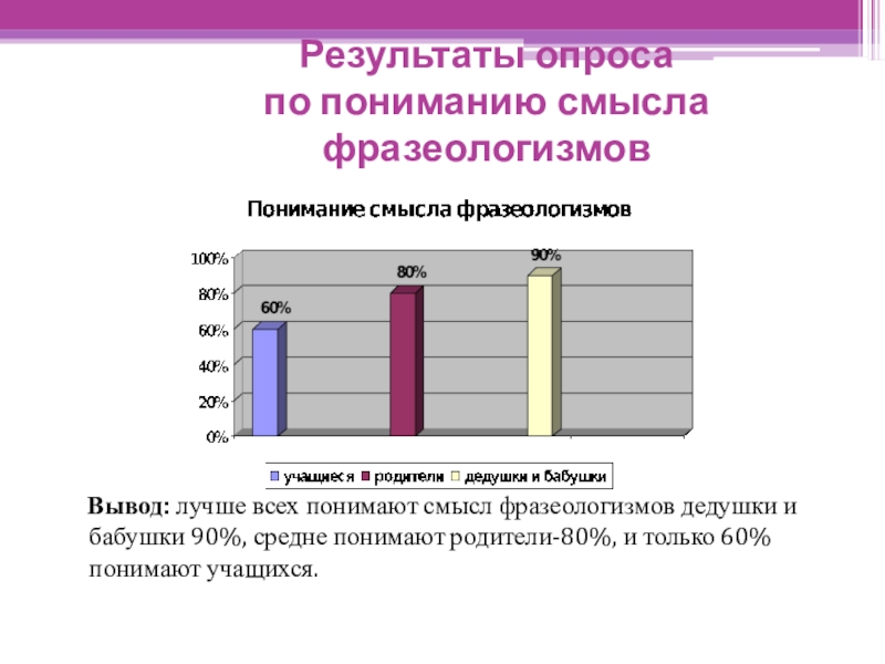 смысл фразеологизмов дедушки и бабушки 90%, средне понимают родители-80%, и только 60% понимают учащихся.