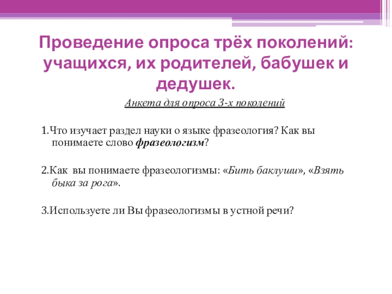 Слайд 12Проведение опроса трёх поколений: учащихся, их родителей, бабушек и дедушек.