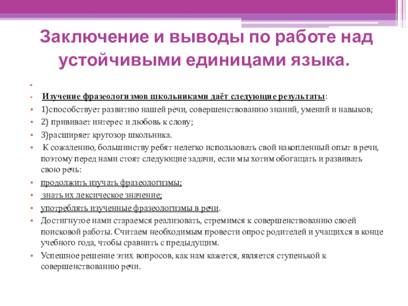Слайд 23 Заключение и выводы по работе над устойчивыми единицами языка.