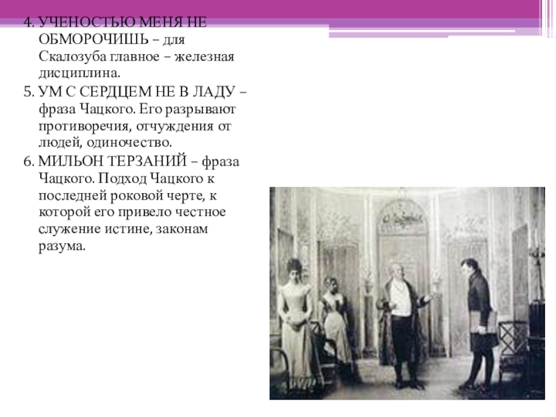 6. МИЛЬОН ТЕРЗАНИЙ – фраза Чацкого. Подход Чацкого к последней роковой черте, к которой его привело честное служение истине, законам разума.