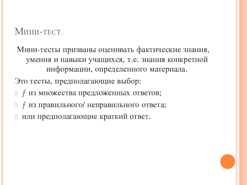 Мини-тесты призваны оценивать фактические знания, умения и навыки учащихся, т.е. знания