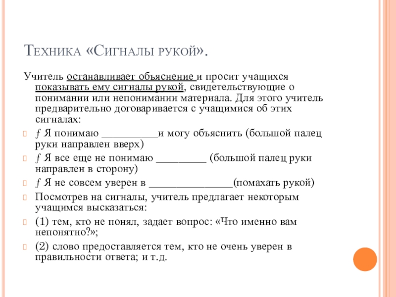 рукой, свидетельствующие о понимании или непонимании материала. Для этого учитель предварительно договаривается с учащимися об этих сигналах: