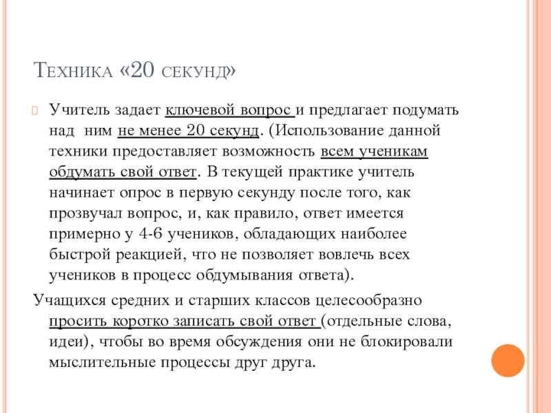 не менее 20 секунд. (Использование данной техники предоставляет возможность всем ученикам обдумать свой ответ. В текущей практике учитель начинает опрос в первую секунду после того, как прозвучал вопрос, и, как правило, ответ имеется примерно у 4-6 учеников, обладающих наиболее быстрой реакцией, что не позволяет вовлечь всех учеников в процесс обдумывания ответа).