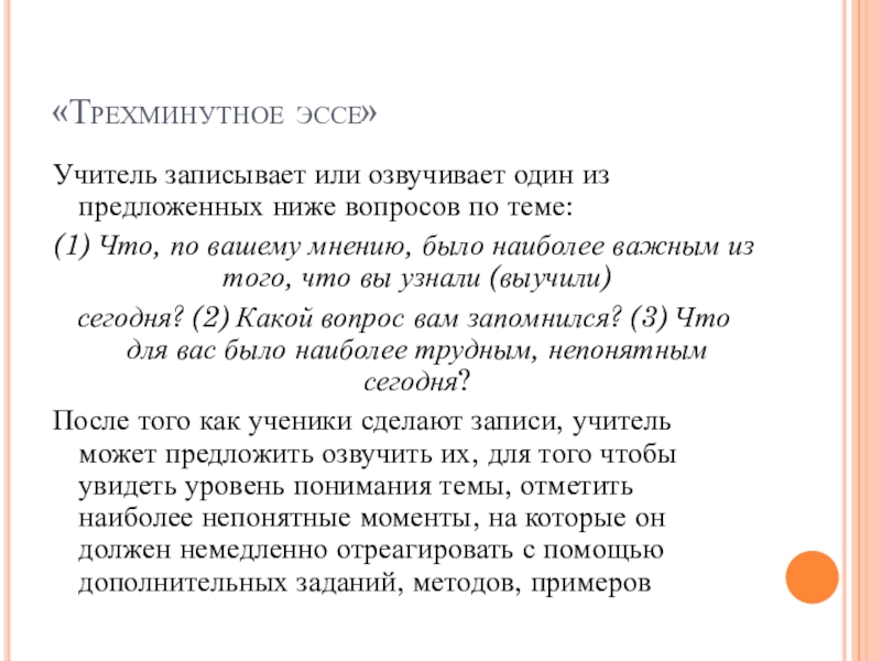 После того как ученики сделают записи, учитель может предложить озвучить их, для того чтобы увидеть уровень понимания темы, отметить наиболее непонятные моменты, на которые он должен немедленно отреагировать с помощью дополнительных заданий, методов, примеров