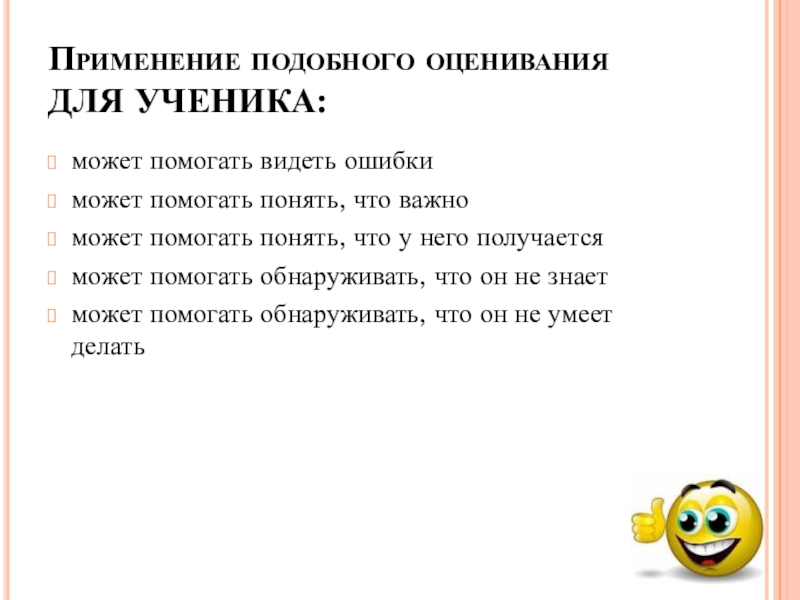 Слайд 4Применение подобного оценивания ДЛЯ УЧЕНИКА: