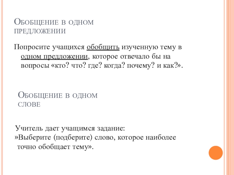Попросите учащихся обобщить изученную тему в одном предложении,