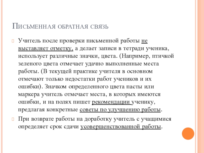 делает записи в тетради ученика, использует различные значки, цвета. (Например, птичкой зеленого цвета отмечает удачно выполненные места работы. (В текущей практике учителя в основном отмечают только недостатки работ учеников и их ошибки). Значком определенного цвета пасты или маркера учитель отмечает места, в которых имеются ошибки, и на полях пишет рекомендации ученику, предлагая конкретные советы по улучшению работы.