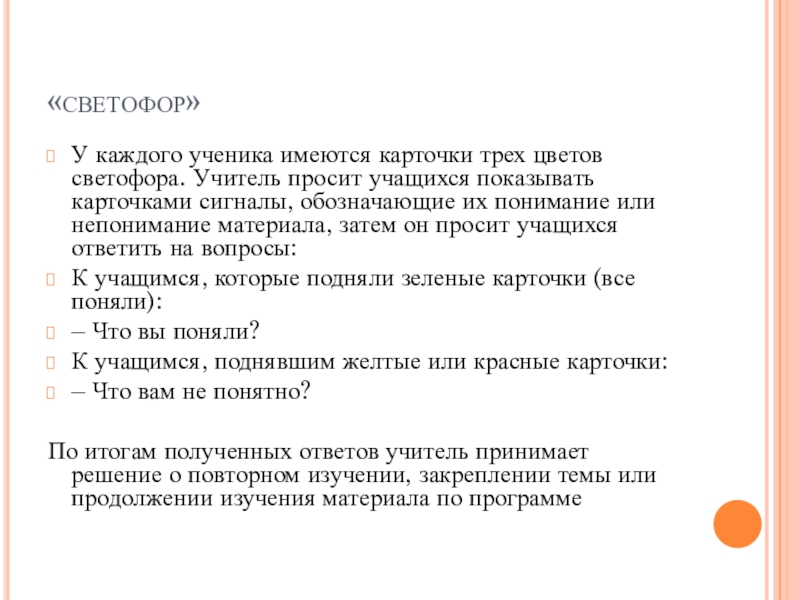 показывать карточками сигналы, обозначающие их понимание или непонимание материала, затем он просит учащихся ответить на вопросы: