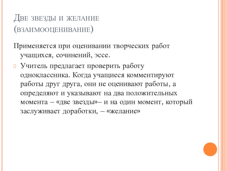 Учитель предлагает проверить работу одноклассника. Когда учащиеся комментируют работы друг друга, они не оценивают работы, а определяют и указывают на два положительных момента – «две звезды»– и на один момент, который заслуживает доработки, – «желание»