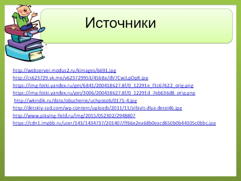 Источникиhttp://webserver.modus2.ru/kimages/6691.jpg http://cs623729.vk.me/v623729953/45b8a/dV7CwJLpOp8.jpghttps://img-fotki.yandex.ru/get/6841/200418627.8f/0_12291e_f1c67622_orig.pnghttps://img-fotki.yandex.ru/get/3006/200418627.8f/0_12291d_7eb636d8_orig.png http://wkindik.ru/data/obuchenie/uchposob/0175-4.jpghttp://detskiy-sad.com/wp-content/uploads/2011/11/alfavit-dlya-detei46.jpghttp://www.playing-field.ru/img/2015/052302/2948807https://cdn1.imgbb.ru/user/143/1434737/201407/ff66e2ea68b0eacd650b0b44105c0bbc.jpg