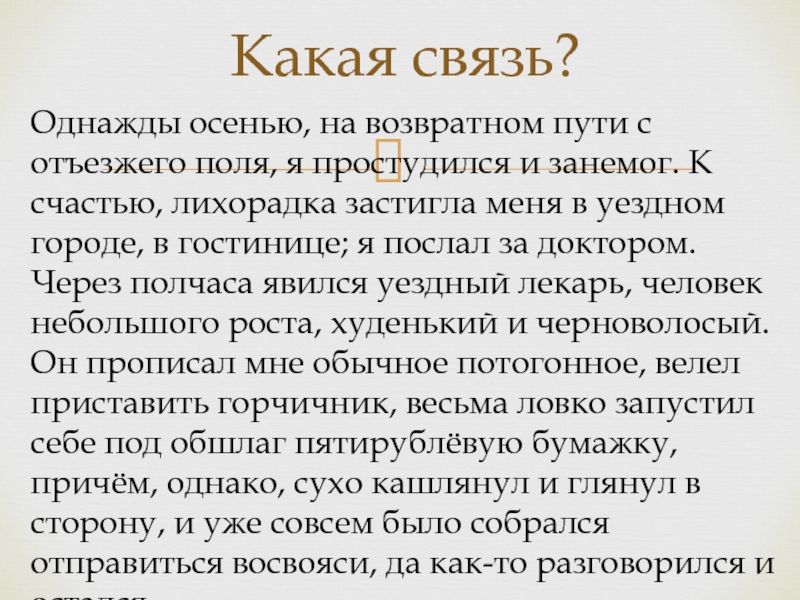 и занемог. К счастью, лихорадка застигла меня в уездном городе, в гостинице; я послал за доктором. Через полчаса явился уездный лекарь, человек небольшого роста, худенький и черноволосый. Он прописал мне обычное потогонное, велел приставить горчичник, весьма ловко запустил себе под обшлаг пятирублёвую бумажку, причём, однако, сухо кашлянул и глянул в сторону, и уже совсем было собрался отправиться восвояси, да как-то разговорился и остался.