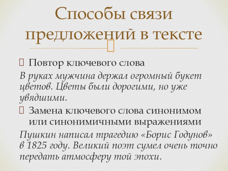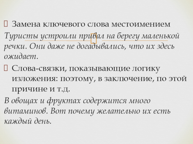 Слова-связки, показывающие логику изложения: поэтому, в заключение, по этой причине и т.д.