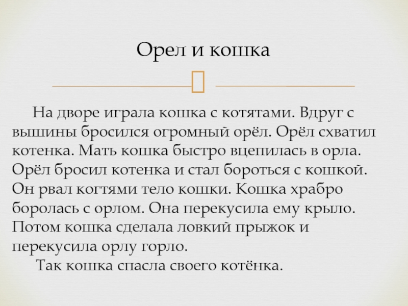 орёл. Орёл схватил котенка. Мать кошка быстро вцепилась в орла. Орёл бросил котенка и стал бороться с кошкой. Он рвал когтями тело кошки. Кошка храбро боролась с орлом. Она перекусила ему крыло. Потом кошка сделала ловкий прыжок и перекусила орлу горло.