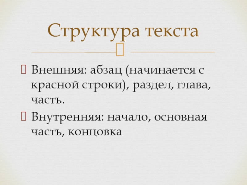 Слайд 25Внешняя: абзац (начинается с красной строки), раздел, глава, часть.