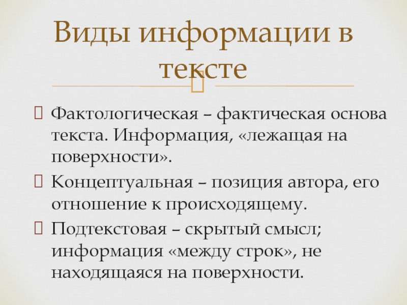 Слайд 24Фактологическая – фактическая основа текста. Информация, «лежащая на поверхности».
