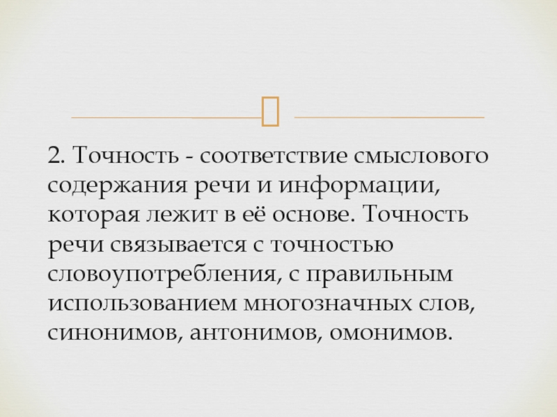 Слайд 62. Точность - соответствие смыслового содержания речи и информации, которая лежит