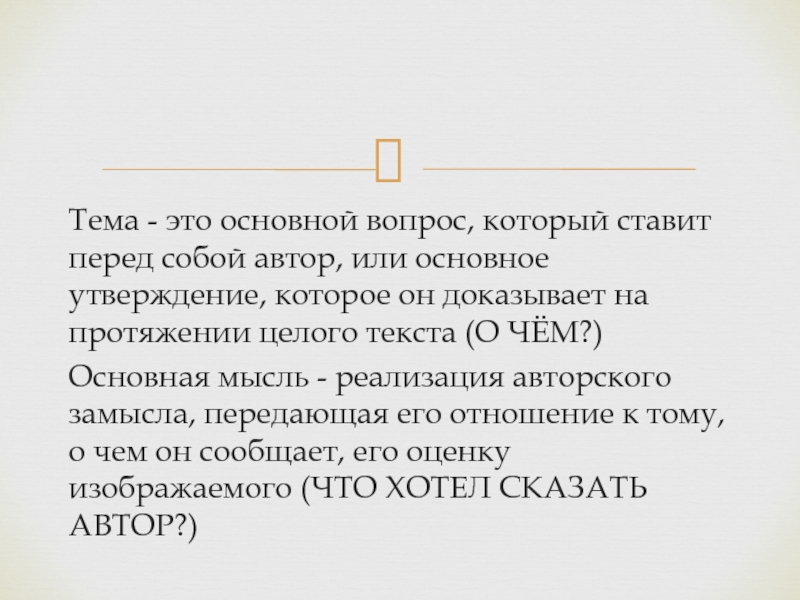 Слайд 22Тема - это основной вопрос, который ставит перед собой автор, или