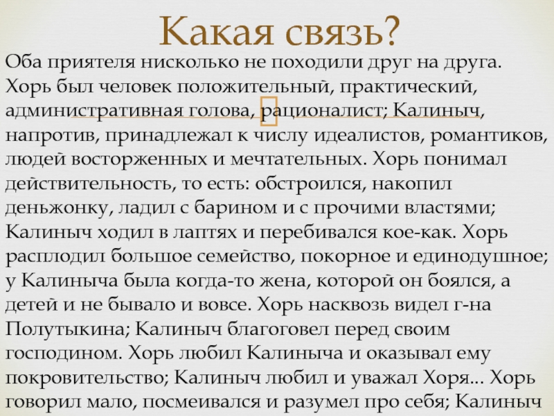 человек положительный, практический, административная голова, рационалист; Калиныч, напротив, принадлежал к числу идеалистов, романтиков, людей восторженных и мечтательных. Хорь понимал действительность, то есть: обстроился, накопил деньжонку, ладил с барином и с прочими властями; Калиныч ходил в лаптях и перебивался кое-как. Хорь расплодил большое семейство, покорное и единодушное; у Калиныча была когда-то жена, которой он боялся, а детей и не бывало и вовсе. Хорь насквозь видел г-на Полутыкина; Калиныч благоговел перед своим господином. Хорь любил Калиныча и оказывал ему покровительство; Калиныч любил и уважал Хоря... Хорь говорил мало, посмеивался и разумел про себя; Калиныч объяснялся с жаром, хотя и не пел соловьём, как бойкий фабричный человек...
