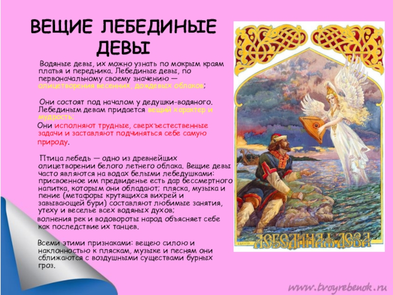 Они состоят под началом у дедушки-водяного. Лебединым девам придается вещий характер и мудрость;