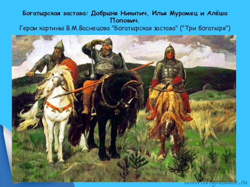 Слайд 8Богатырская застава: Добрыня Никитич, Илья Муромец и Алёша Попович.