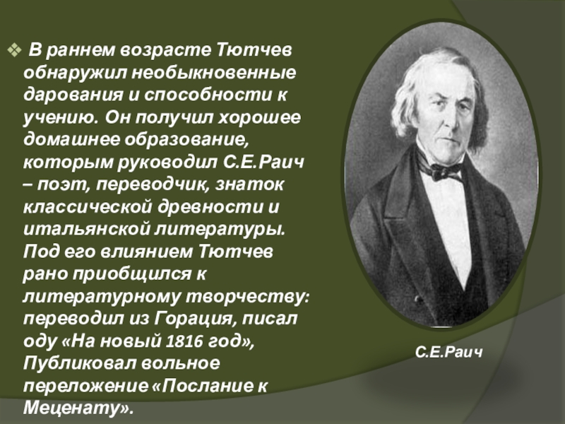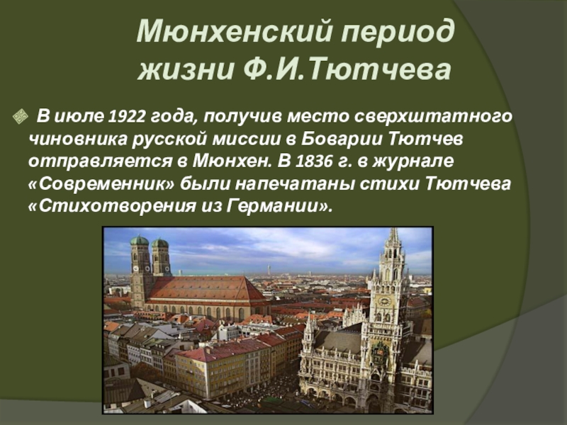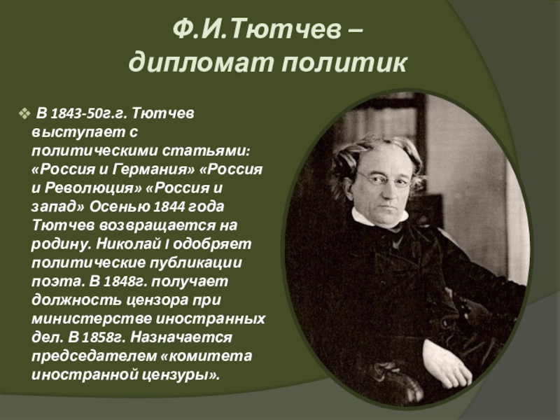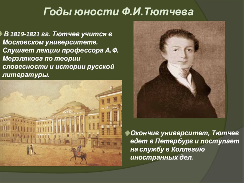 Окончив университет, Тютчев едет в Петербург и поступает на службу в Коллегию иностранных дел.