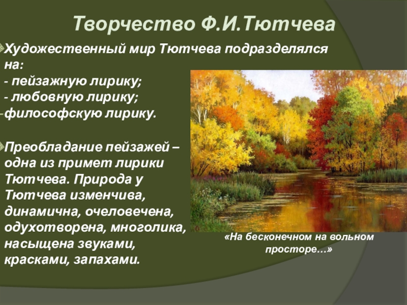 Преобладание пейзажей – одна из примет лирики Тютчева. Природа у Тютчева изменчива, динамична, очеловечена, одухотворена, многолика, насыщена звуками, красками, запахами.