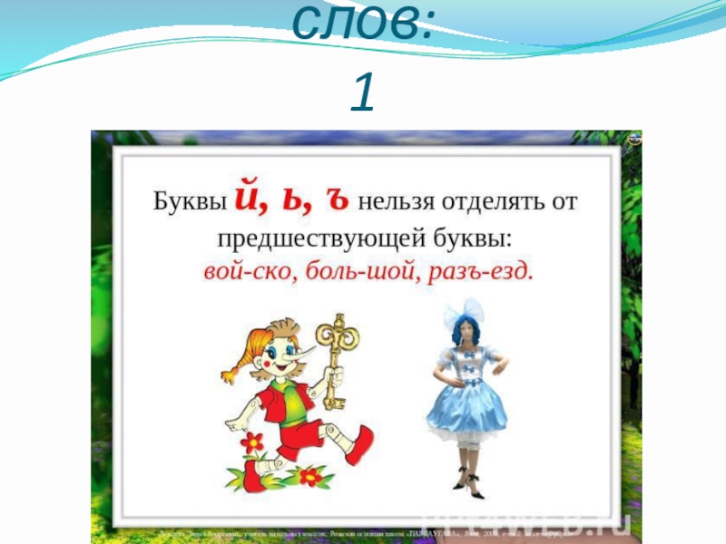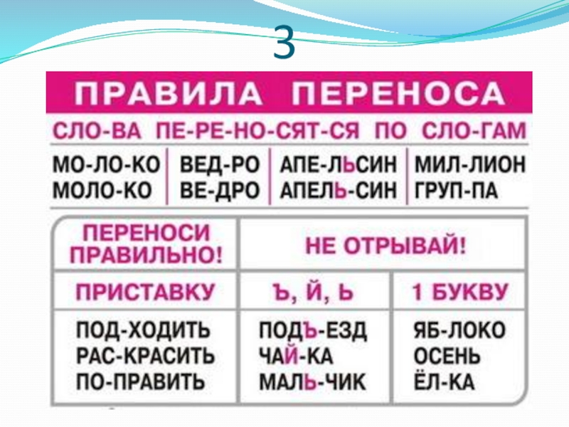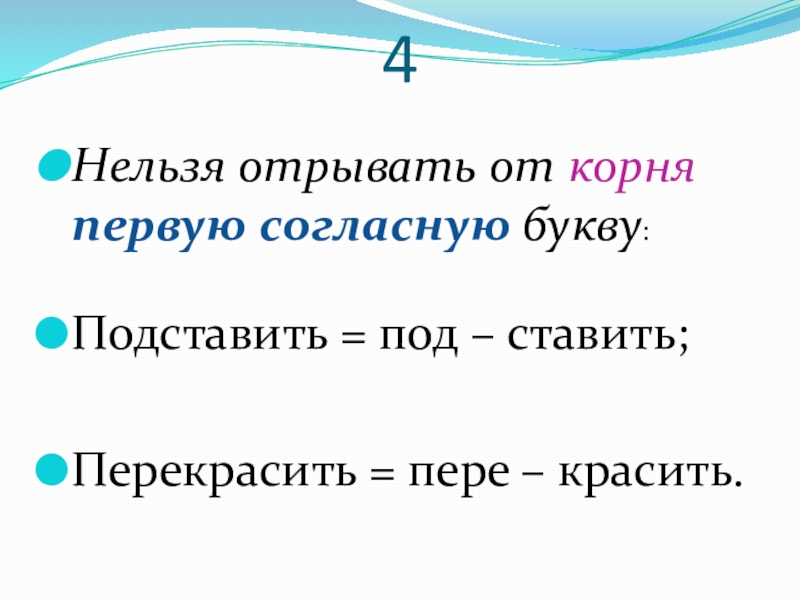 4Нельзя отрывать от корня первую согласную букву:Подставить = под – ставить;Перекрасить = пере – красить.