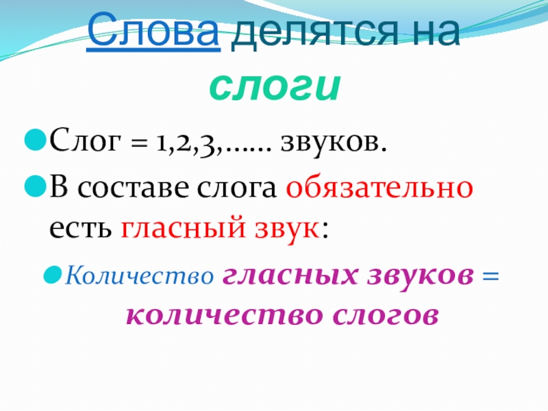 Слова делятся на слогиСлог = 1,2,3,…… звуков.В составе слога обязательно есть гласный звук:Количество гласных звуков = количество слогов