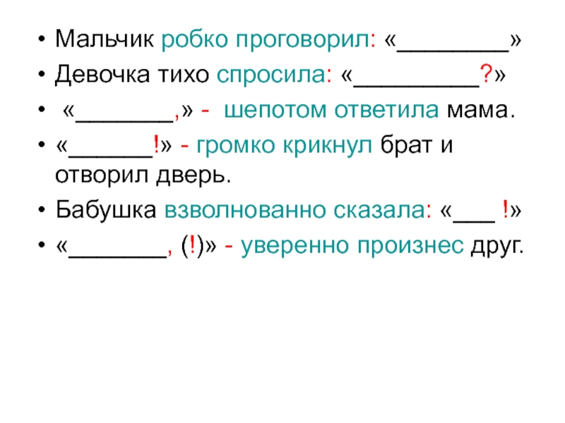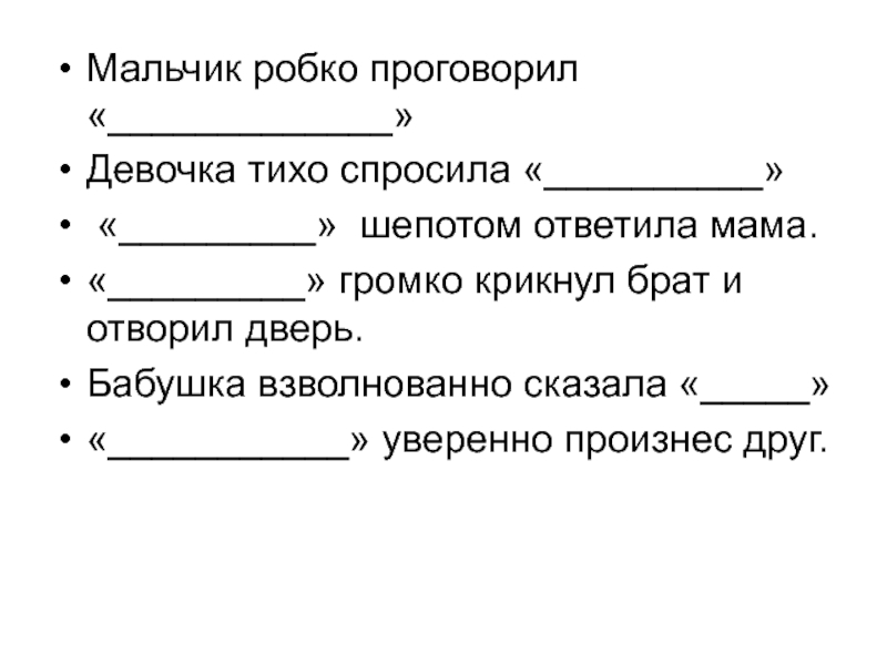 Мальчик робко проговорил «_____________» Девочка тихо спросила «__________» «_________» шепотом ответила мама. «_________» громко крикнул брат и