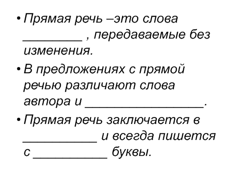 Прямая речь –это слова говорящего , передаваемые без изменения.
