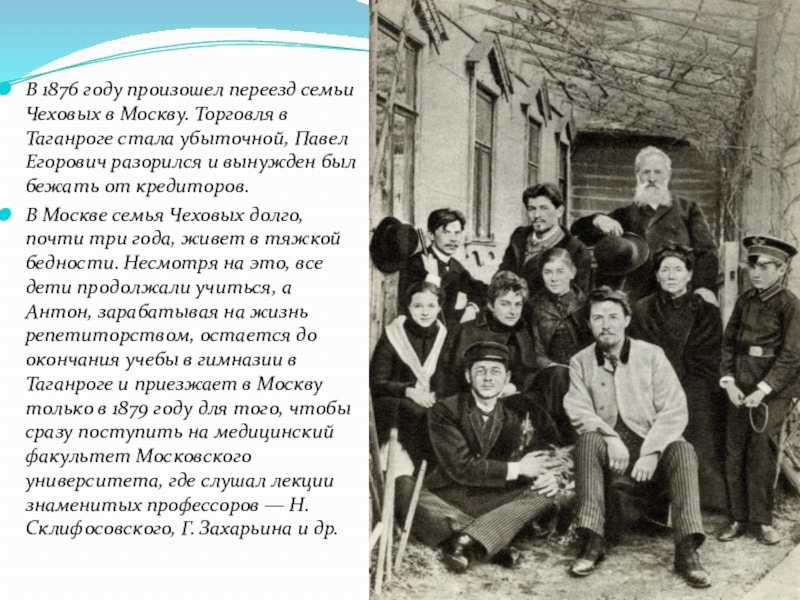 В Москве семья Чеховых долго, почти три года, живет в тяжкой бедности. Несмотря на это, все дети продолжали учиться, а Антон, зарабатывая на жизнь репетиторством, остается до окончания учебы в гимназии в Таганроге и приезжает в Москву только в 1879 году для того, чтобы сразу поступить на медицинский факультет Московского университета, где слушал лекции знаменитых профессоров — Н. Склифосовского, Г. Захарьина и др.