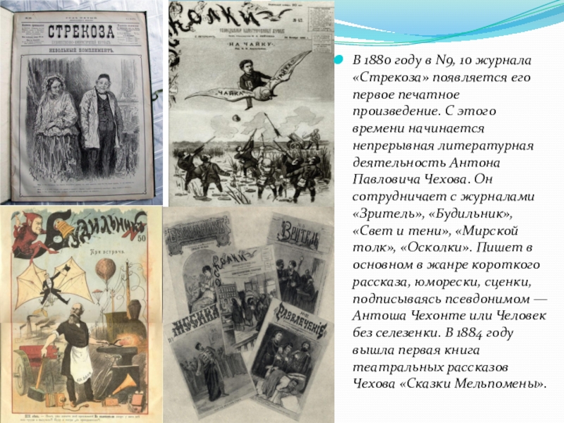 печатное произведение. С этого времени начинается непрерывная литературная деятельность Антона Павловича Чехова. Он сотрудничает с журналами «Зритель», «Будильник», «Свет и тени», «Мирской толк», «Осколки». Пишет в основном в жанре короткого рассказа, юморески, сценки, подписываясь псевдонимом — Антоша Чехонте или Человек без селезенки. В 1884 году вышла первая книга театральных рассказов Чехова «Сказки Мельпомены».