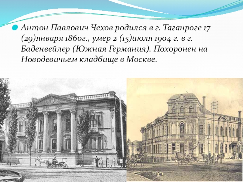 Слайд 2Антон Павлович Чехов родился в г. Таганроге 17 (29)января 1860г., умер