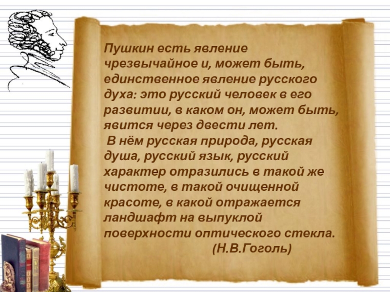 Пушкин есть явление чрезвычайное и, может быть, единственное явление русского духа: это русский человек в его развитии,
