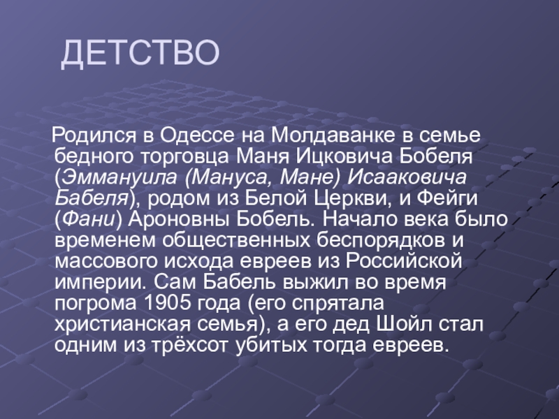 Маня Ицковича Бобеля (Эммануила (Мануса, Мане) Исааковича Бабеля), родом из Белой Церкви, и Фейги (Фани) Ароновны Бобель. Начало века было временем общественных беспорядков и массового исхода евреев из Российской империи. Сам Бабель выжил во время погрома 1905 года (его спрятала христианская семья), а его дед Шойл стал одним из трёхсот убитых тогда евреев.