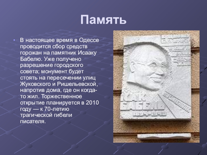 Исааку Бабелю. Уже получено разрешение городского совета; монумент будет стоять на пересечении улиц Жуковского и Ришельевской, напротив дома, где он когда-то жил. Торжественное открытие планируется в 2010 году — к 70-летию трагической гибели писателя.