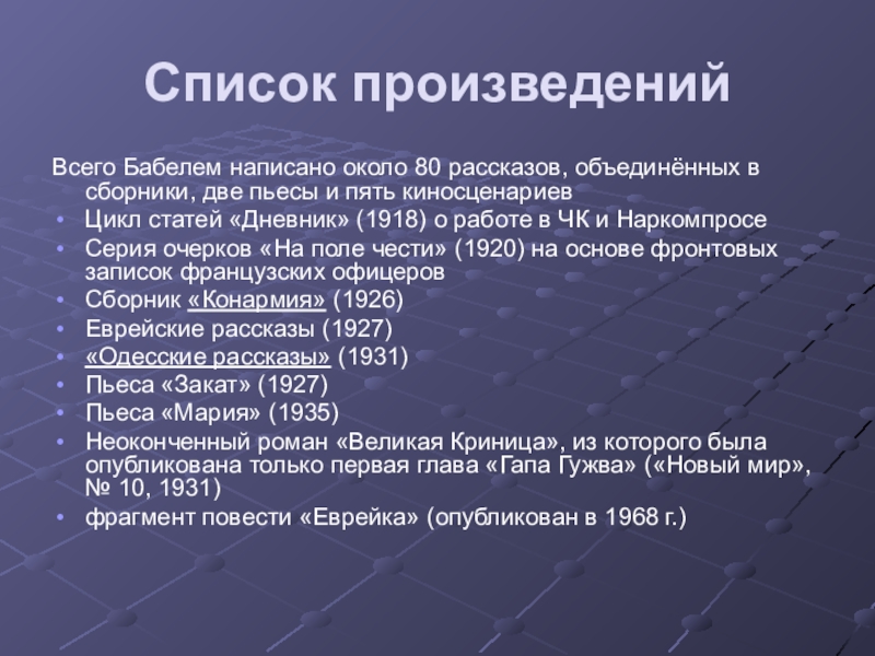 Всего Бабелем написано около 80 рассказов, объединённых в сборники, две
