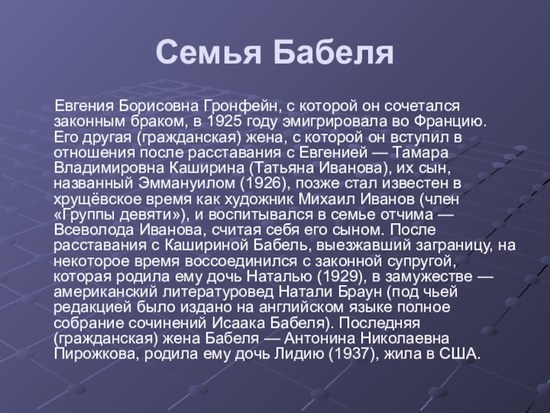 законным браком, в 1925 году эмигрировала во Францию. Его другая (гражданская) жена, с которой он вступил в отношения после расставания с Евгенией — Тамара Владимировна Каширина (Татьяна Иванова), их сын, названный Эммануилом (1926), позже стал известен в хрущёвское время как художник Михаил Иванов (член «Группы девяти»), и воспитывался в семье отчима — Всеволода Иванова, считая себя его сыном. После расставания с Кашириной Бабель, выезжавший заграницу, на некоторое время воссоединился с законной супругой, которая родила ему дочь Наталью (1929), в замужестве — американский литературовед Натали Браун (под чьей редакцией было издано на английском языке полное собрание сочинений Исаака Бабеля). Последняя (гражданская) жена Бабеля — Антонина Николаевна Пирожкова, родила ему дочь Лидию (1937), жила в США.