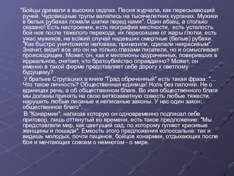 Слайд 14 "Бойцы дремали в высоких седлах. Песня журчала, как