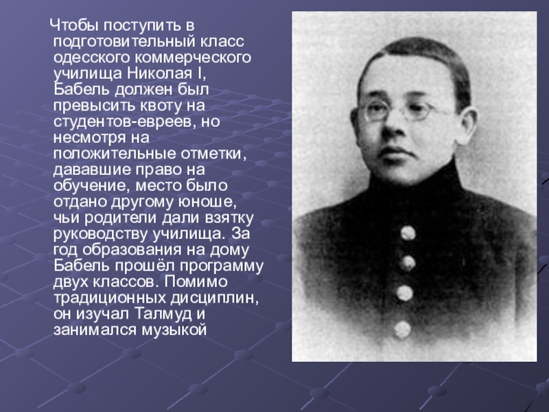 Николая I, Бабель должен был превысить квоту на студентов-евреев, но несмотря на положительные отметки, дававшие право на обучение, место было отдано другому юноше, чьи родители дали взятку руководству училища. За год образования на дому Бабель прошёл программу двух классов. Помимо традиционных дисциплин, он изучал Талмуд и занимался музыкой