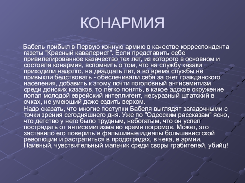 корреспондента газеты "Красный кавалерист". Если представить себе привилегированное казачество тех лет, из которого в основном и состояла конармия, вспомнить о том, что на службу казаки приходили надолго, на двадцать лет, а во время службы не привыкли бедствовать - обеспечивали себя за счет гражданского населения, добавить к этому почти поголовный антисемитизм среди донских казаков, то легко понять, в какое адское окружение попал молодой еврейский интеллигент, несуразный штатский в очках, не умеющий даже ездить верхом.