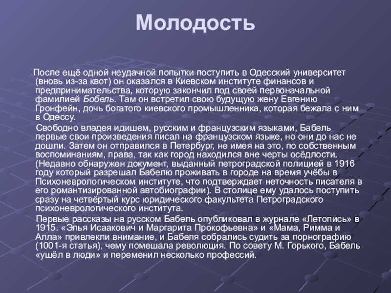 Свободно владея идишем, русским и французским языками, Бабель первые свои произведения писал на французском языке, но они до нас не дошли. Затем он отправился в Петербург, не имея на это, по собственным воспоминаниям, права, так как город находился вне черты осёдлости. (Недавно обнаружен документ, выданный петроградской полицией в 1916 году который разрешал Бабелю проживать в городе на время учёбы в Психоневрологическом институте, что подтверждает неточность писателя в его романтизированной автобиографии). В столице ему удалось поступить сразу на четвёртый курс юридического факультета Петроградского психоневрологического института.
